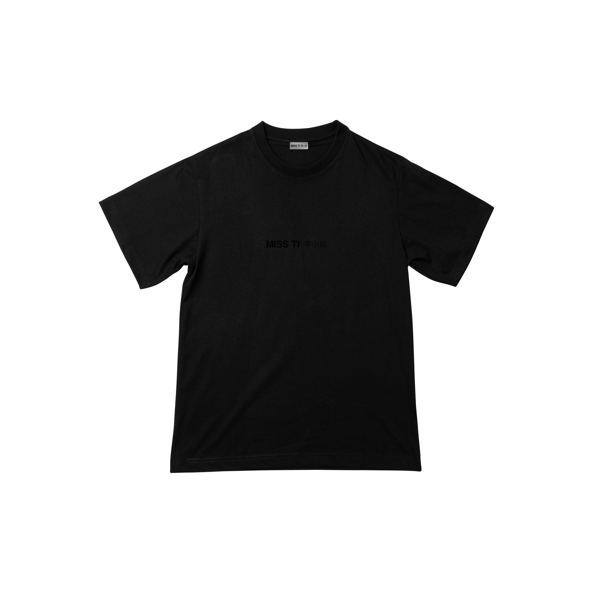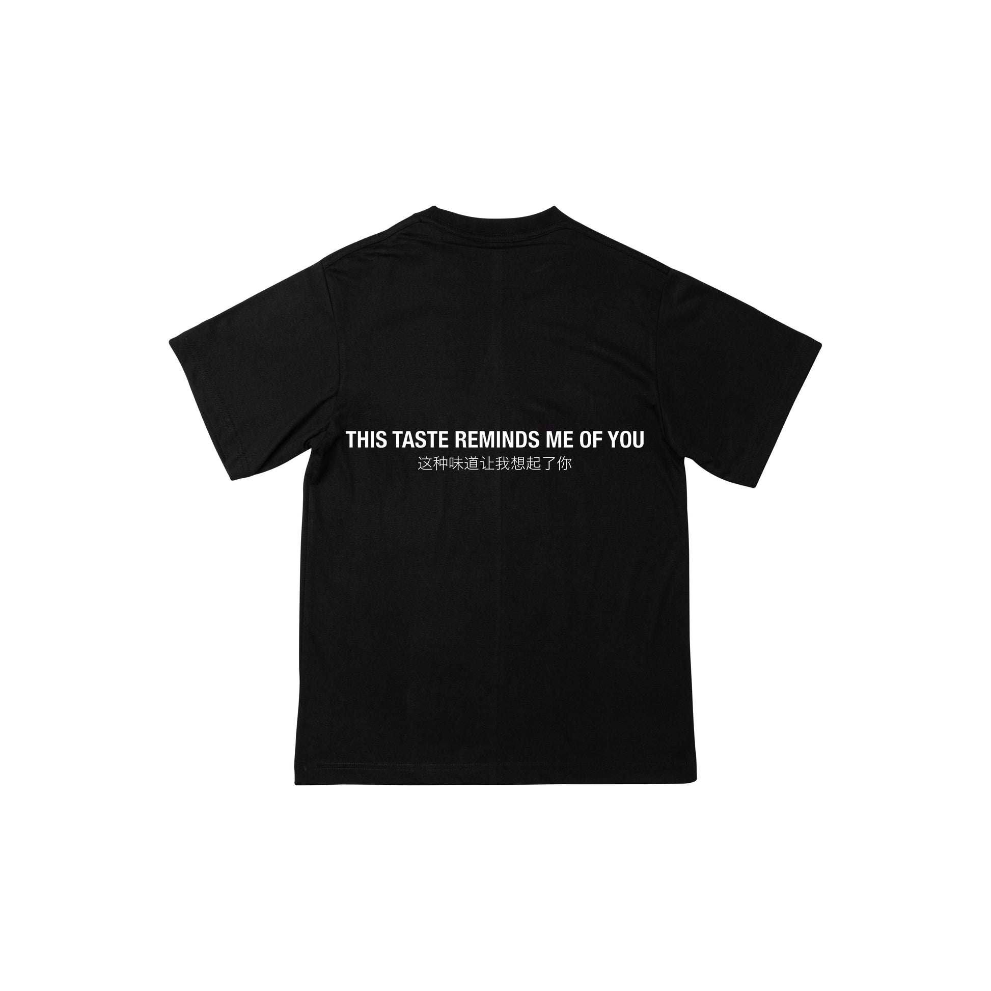 Black cotton T-shirt with short sleeves. Embroidered MISS TI 蒂小姐 logo on the front. "THIS TASTE REMINDS ME OF YOU" graphic on the back.